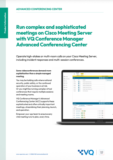 Run complex and sophisticated meetings on Cisco Meeting Server With VQ Conference Manager Advanced Conferencing Center. Operate high-stakes or multi-room calls on your Cisco Meeting Server, including incident responses and multi-session conferences.