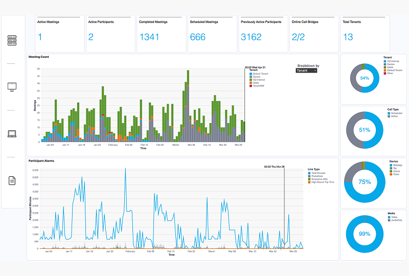 - Access service-wide insights covering meetings, participants, video devices, edge devices, and Cisco Meeting Server